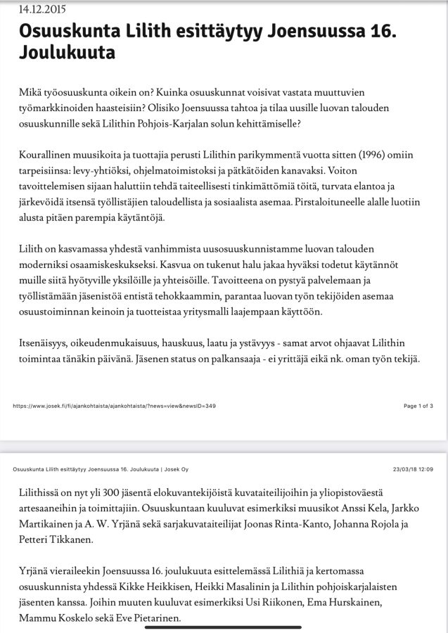 Osuuskunta toimi hyvin moninaisesti eri tilaajien tuotantoyhtiönä jäsenten töissä, muiden muassa graafisen suunnittelun, kuvittamisen, äänisuunnittelun, äänittäjän, toimittajan, valokuvaajan, leikkaajan, elokuvaajan, tuottajan ja ohjaajan töissä. Lilith oli muutamien osuuskunnan jäsenten ja ei-jäsenen esitysvälittäjä tai ohjelma- ja asioidenhoitotoimisto.