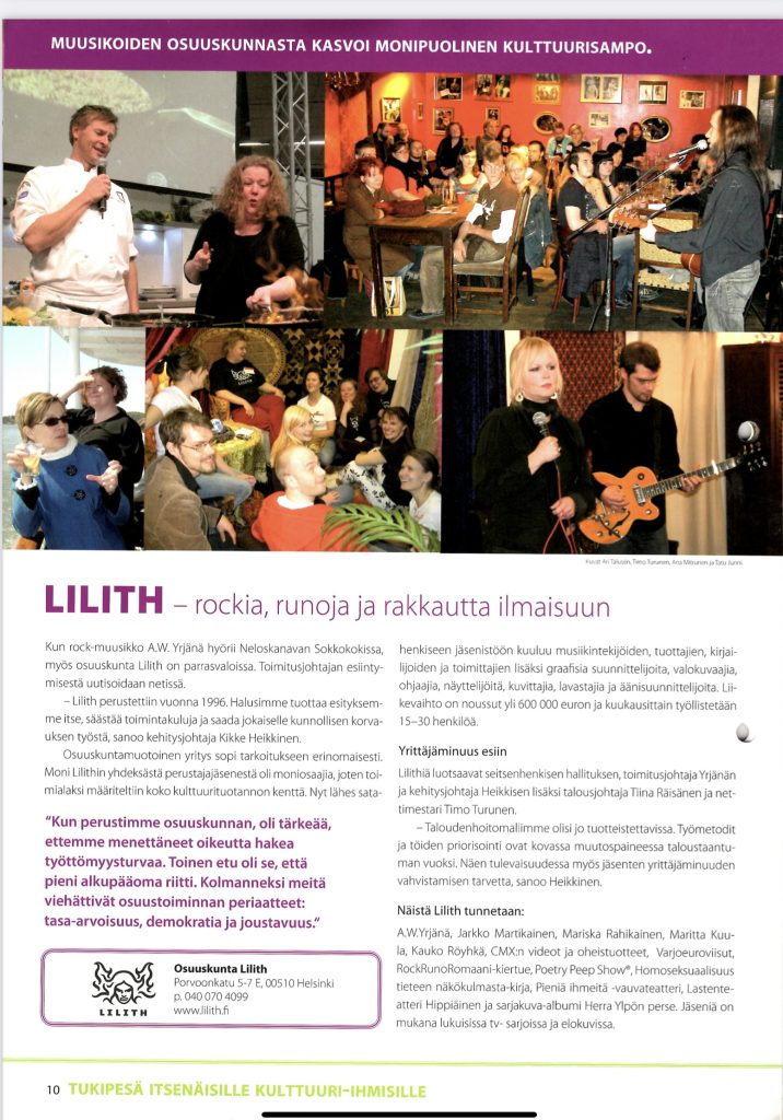 Osuuskunta toimi hyvin moninaisesti eri tilaajien tuotantoyhtiönä jäsenten töissä, muiden muassa graafisen suunnittelun, kuvittamisen, äänisuunnittelun, äänittäjän, toimittajan, valokuvaajan, leikkaajan, elokuvaajan, tuottajan ja ohjaajan töissä. Lilith oli muutamien osuuskunnan jäsenten ja ei-jäsenen esitysvälittäjä tai ohjelma- ja asioidenhoitotoimisto.